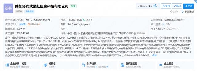 企查查显示,彩虹夫妇关联公司成都彩彩就是虹信息科技有限公司成立于 2020 年 12 月 4 日,法定代表人为孙彩虹,注册资本 100 万,经营范围包括信息技术咨询服务、市场营销策划、货物进出口、食品互联网销售、化妆品批发等。