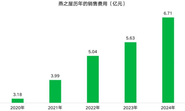 这一系列操作反映到财报上,燕之屋的销售及经销开支逐年增长。2021 年至 2023 年燕之屋的销售及经销开支分别为 3.99 亿元、5.04 亿元和 5.63 亿元,2024 年更是达到 6.71 亿元,占营收的比重高达 32.7%。这也是燕之屋"增收不增利"的主要原因。
