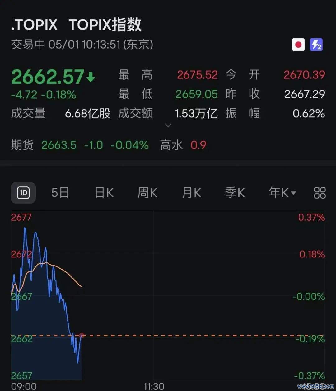 今早,日经225指数开盘后走高,不过,截至发稿突现跳水,其中,日经225指数涨跌幅收窄,此前一度涨近1%,东证股价指数与JPX日经400指数直接飘绿。