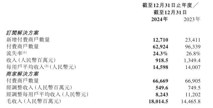 此外,财报还显示,2024年,商家通过有赞的解决方案产生的GMV(商品交易总额)为1028亿元。平均单个商家的销售额在2024年同比增长约14%。门店SaaS业务的GMV为519亿元。