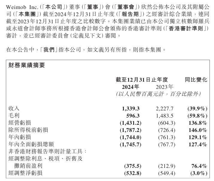 3月21日,微盟集团(HK02013,以下简称微盟)公布的2024年业绩显示,其2024年总营收为13.39亿元,同比减少39.9%,年内亏损17.44亿元,经调整净亏损为5.33亿元,同比收窄3.0%。