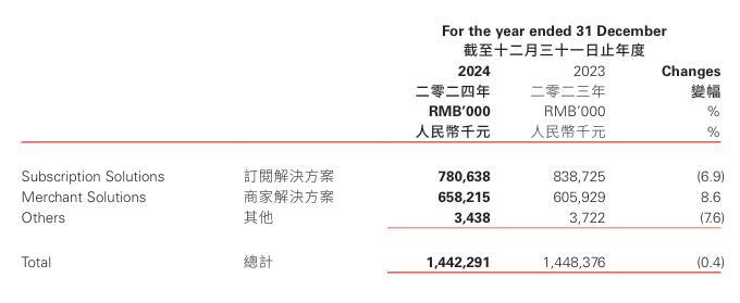 数据显示,有赞订阅解决方案收益在2024年同比减少6.9%,主要原因是付费商家数量下降。不过,有赞的另一业务——商家解决方案,在2024年实现收入同比增长8.6%,有赞解释称,这主要是由于物流解决方案收入增加。